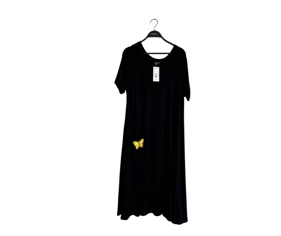Kjole, Viscose, A-facon m/gul sommerfugl på lomme, Sort