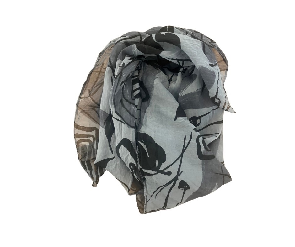Tørklæde silke/bomuld, Blade og striber, Grå