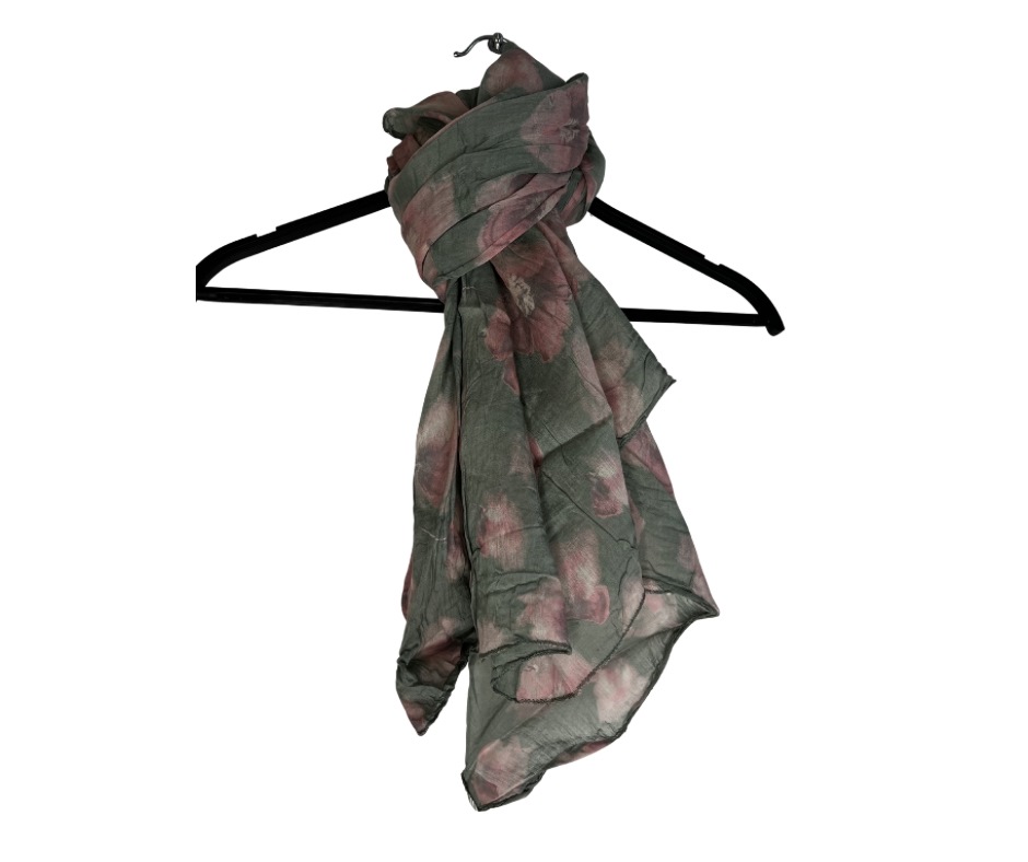 Tørklæde silke/bomuld, Store Rosa Blomster, Grøn